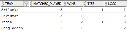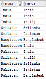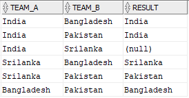 INSERT INTO MATCH_RESULTS VALUES('Srilanka','Bangladesh','Srilanka');
