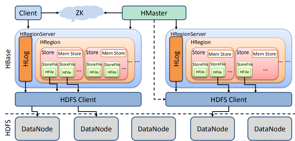 图解: 上图展示了 HBase 的主从架构。客户端通过 ZooKeeper 定位 RegionServer。HMaster 负责集群管理和元数据维护,而 RegionServer 则直接处理数据读写请求,并将数据最终存储在 HDFS 上。