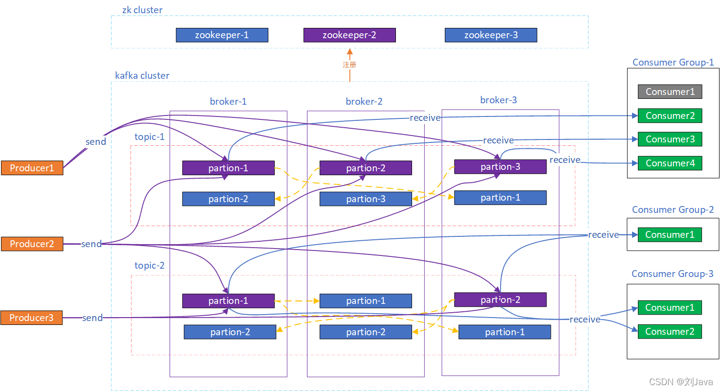 - Zookeeper (旧架构): 作为独立的协调服务,负责 Broker 注册、Topic 配置管理、Leader 选举和消费者组 rebalance 等元数据管理工作。它虽然强大,但也增加了系统的运维复杂性。