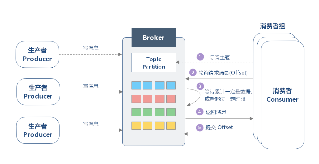 Partition (分区) & Offset (偏移量): 分区是 Topic 的物理划分,一个 Topic 可以包含多个分区。每个 Partition 是一个有序、不可变的消息序列,是 Kafka 实现并行处理和水平扩展的关键。Offset 是分区内每条消息的唯一、单调递增的ID,用于标识消息位置。