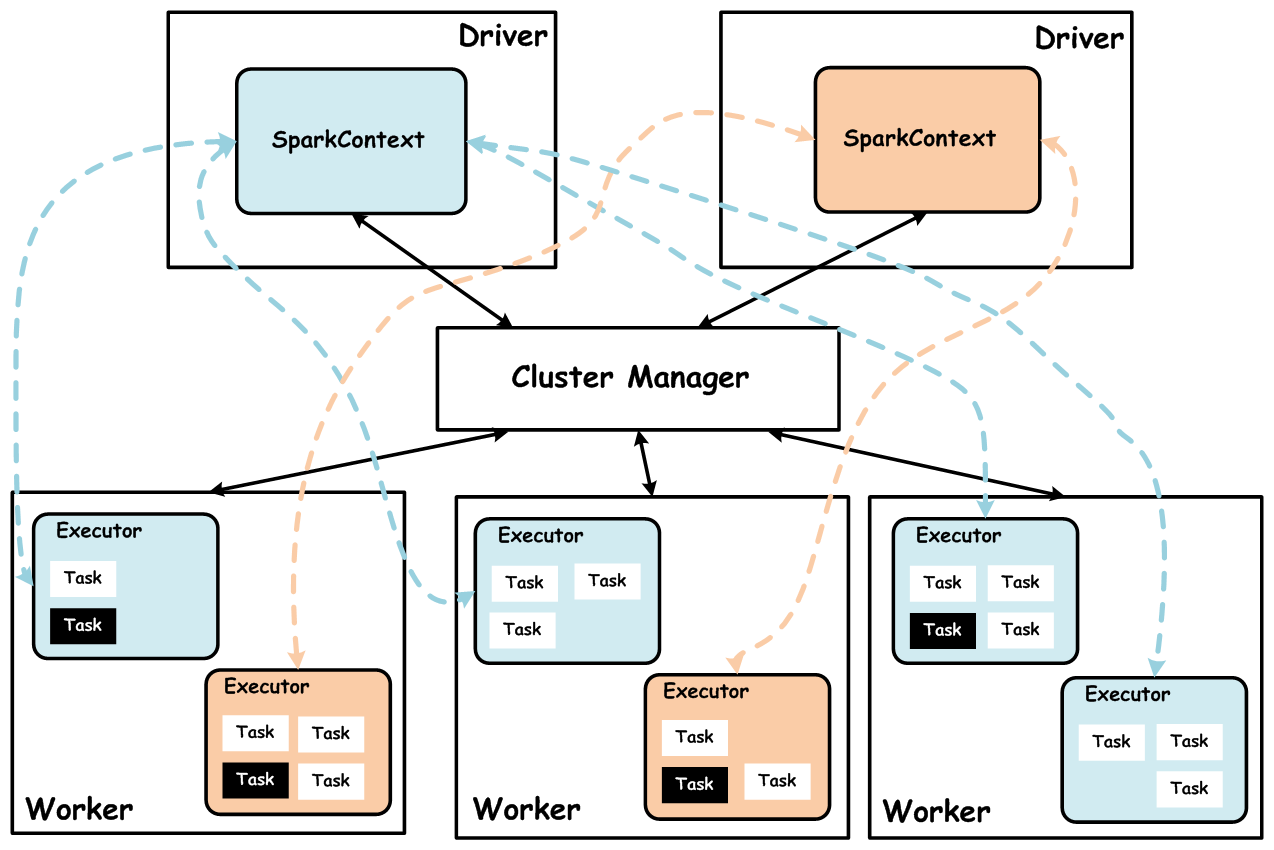 - 应用结束:当所有任务执行完毕,Driver调用sc.stop()方法,向Cluster Manager注销应用程序并释放所有Executor资源。